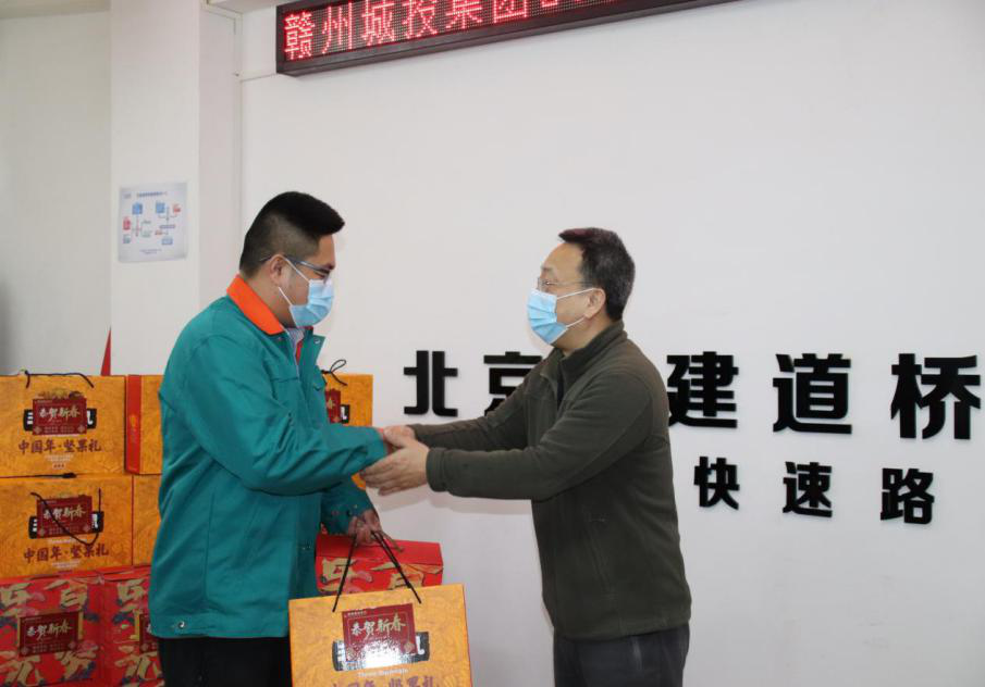2月9日,贛州城投集團(tuán)開展2021年春節(jié)慰問市域外留贛州過(guò)年人員活動(dòng),為留在贛州過(guò)年的市域外集團(tuán)員工及項(xiàng)目工人送上年貨禮包,讓他們就地過(guò)好溫馨春節(jié)。