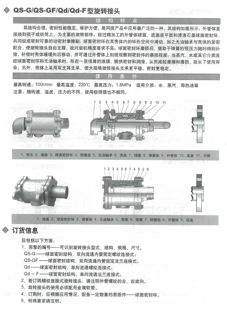 其結(jié)構(gòu)合理、密封性能穩(wěn)定、維護(hù)方便,是同類產(chǎn)品中應(yīng)用最廣泛的一種。其結(jié)構(gòu)如圖所示:外管體直接接到輥?zhàn)踊蚝嫱采希瑸橹饕男D(zhuǎn)部件:經(jīng)過(guò)精加工的外管體球面、底蓋底平面和浸漬石墨球面密封環(huán),共同組成密封可靠的動(dòng)密封摩擦副;球面密封環(huán)在其殼體內(nèi)的環(huán)形空間中滑動(dòng),加之無(wú)油軸承與殼體的緊密配合,使旋轉(zhuǎn)接頭自由支撐,故對(duì)裝機(jī)精度要求不高;球面密封環(huán)磨損后,借助于彈簧的預(yù)壓力隨時(shí)得到補(bǔ)償,補(bǔ)償時(shí)殼體緩緩向后移動(dòng),并可通過(guò)外管體上刻線觀察到密封件的磨損程度;當(dāng)蒸汽、水或其它介質(zhì)流經(jīng)球面密封環(huán)和無(wú)油軸承時(shí),形在一層很薄的液膜,提供密封和潤(rùn)滑,從而減輕摩擦和磨損,延長(zhǎng)了使用壽命。另外,殼體上采用雙支耳支承,使大規(guī)格旋轉(zhuǎn)接頭支承更平穩(wěn),密封更穩(wěn)定。
