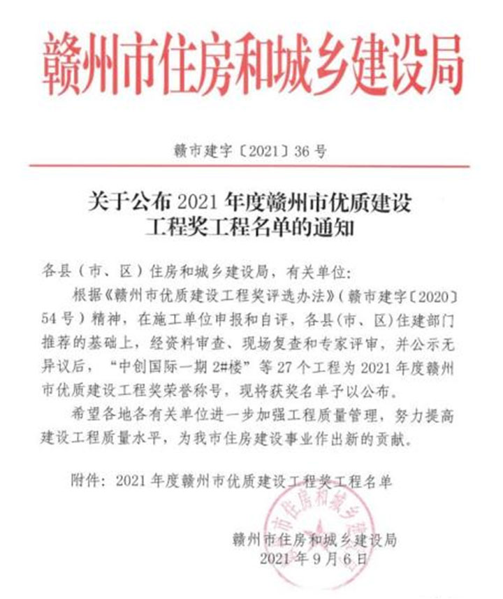 日前,贛州市住房和城鄉(xiāng)建設局公布了2021年度贛州市優(yōu)質(zhì)建設工程獎工程名單,由贛州城投集團承建的贛南職業(yè)技術學院、贛州市中心城區(qū)贛南大道快速路工程一標段(新世紀大橋至章江大橋西側)、贛州市迎賓大道(含飛翔路段)及文明大道快速路工程二標段、高架主干路網(wǎng)建設工程(贛州市客家大道西延高架段)、東江源大道北延(105國道和樂段)市政道路工程共5個項目獲獎。