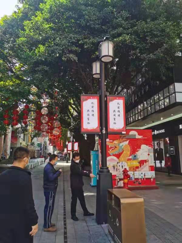25日,考察組到廣州市北京路歷史文化街區(qū)調(diào)研由廣州無(wú)線電集團(tuán)旗下子公司負(fù)責(zé)建設(shè)的智慧燈桿項(xiàng)目