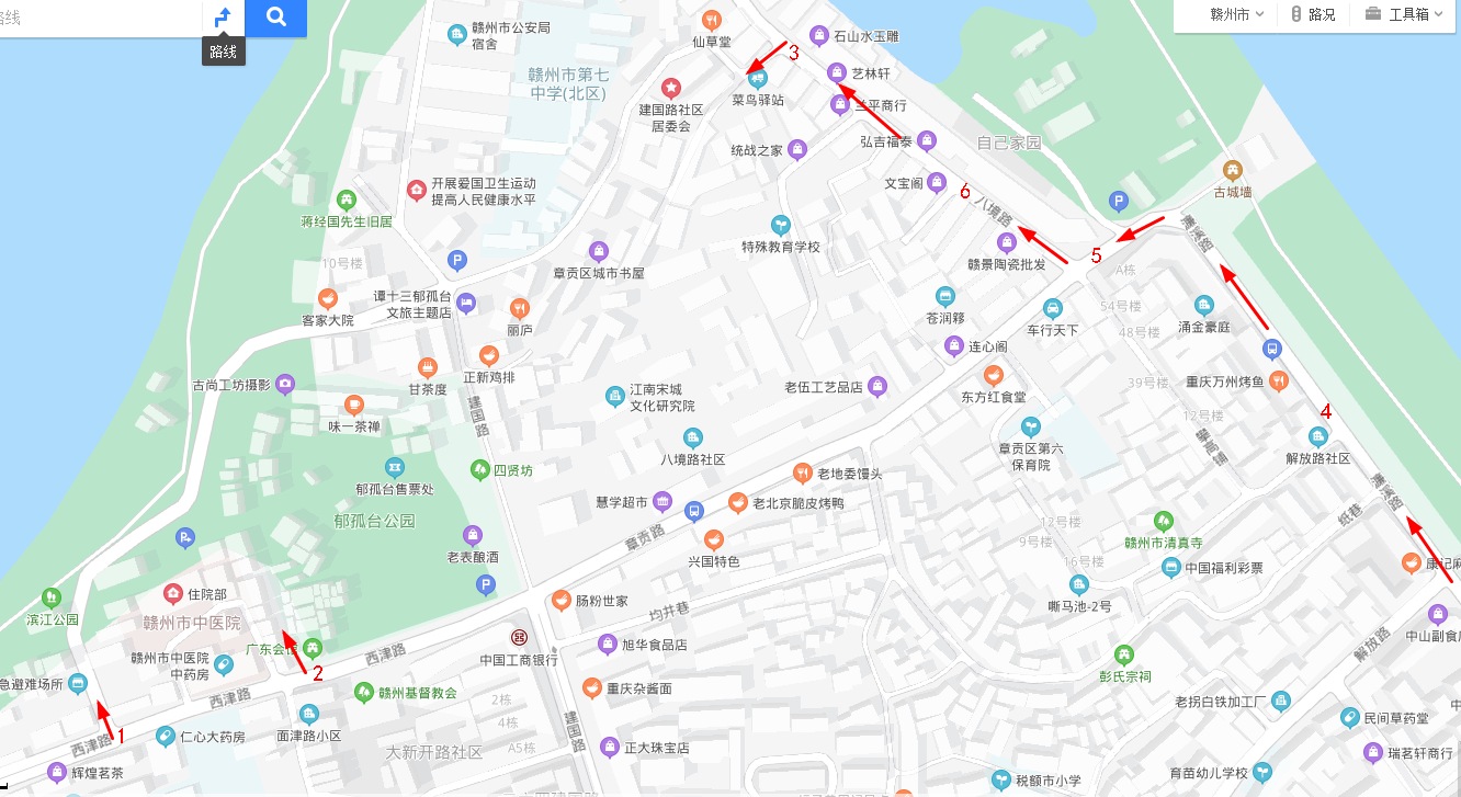 三、限流管理期間,持有通行證的郁孤臺(tái)街區(qū)內(nèi)居民或車輛,請(qǐng)統(tǒng)一從八境路支巷景區(qū)入口(國(guó)力教育、贛七中方向)進(jìn)出。路線方案為:濂溪路(如圖紅色標(biāo)記4)→章貢路(如圖紅色標(biāo)記5)→八境路(如圖紅色標(biāo)記6)→八境路支巷景區(qū)入口(如圖紅色標(biāo)記3)。